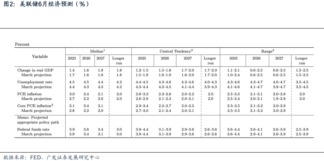 6月经济预测摘要(Summary of Economic Projections,SEP)中,美联储将2025、2026年GDP增速分别下调至1.7%和1.8%,前值分别为2.1%和2%。25年失业率预测略微上调至4.4%,前值4.3%;2026年失业率预测保持在4.3%。25年PCE和核心PCE预测上调至2.7%和2.8%,前值为2.5%。