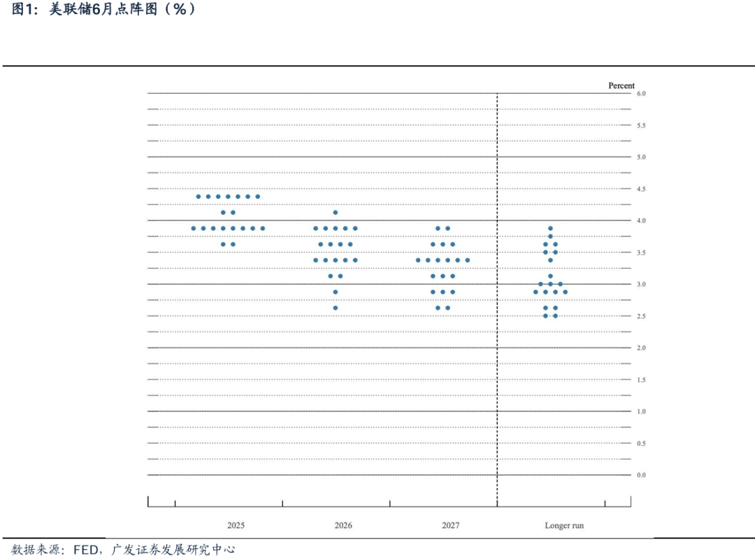 美联储一般在每年3、6、9、12月的会议中会公布点阵图,是美联储官员对未来政策利率预测的图谱,通常被市场看做美联储前瞻指引的一种方式。点阵图(dot plot)关于2025年降息的基准预测(按中值)和3月保持一致,即年内降息2次,但内部分歧较3月有所扩大。19位与会者中,10位与会者认为今年至少两次降息,2位预计降息一次,7位预计全年不降息(3月为4位)。此外,6月点阵图预测2026年降息1次(3月为2次);2027年降息1次(和3月一致)。政策利率在2025、2026、2027年分别回落至3.875%、3.625%、3.375%,前值分别为3.875%、3.375%、3.125%。长期政策利率预期保持在3%。